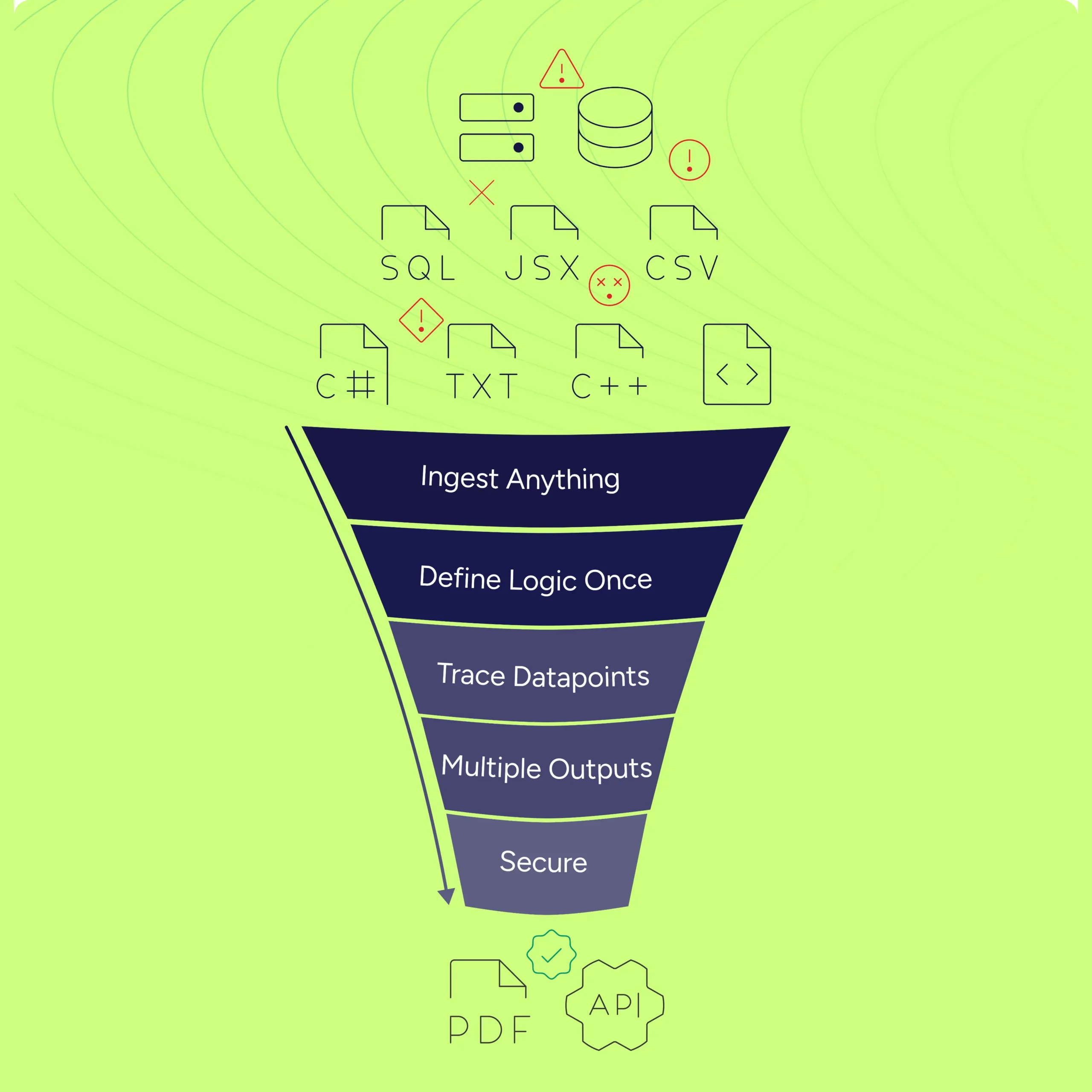 Support for Excel, CSV, APIs, S3, and databases with no code rewrites.